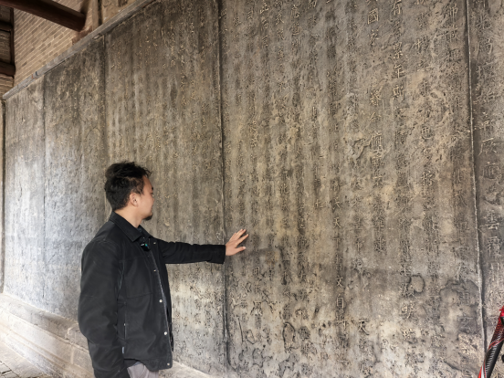 万荣后土庙文物保护所副所长谢杰抚摸萧墙碑(图片来源:山西新闻网)