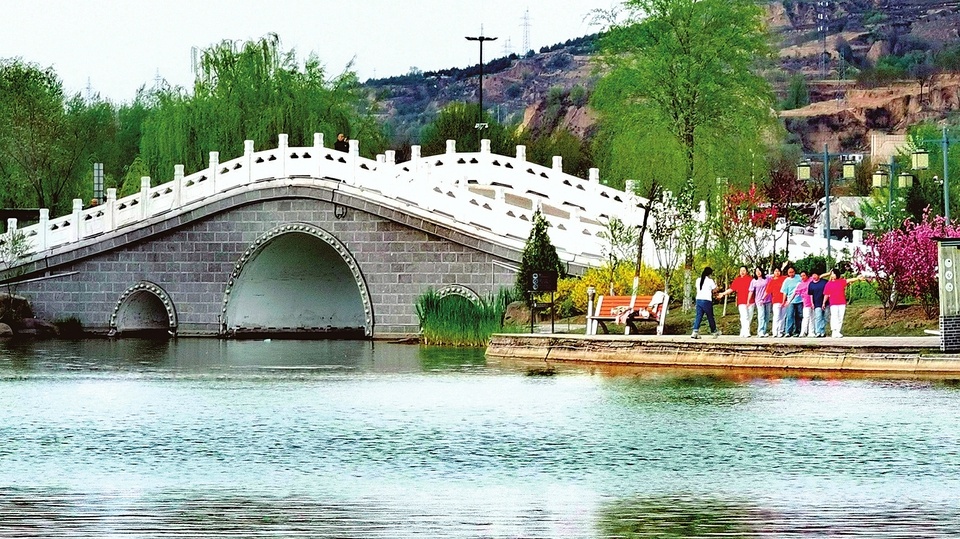 近日,山西吕梁新区如意湖公园水清岸绿、繁花盛放,市民在花下留影,乐享春日好时光。(郭炳中 摄)
