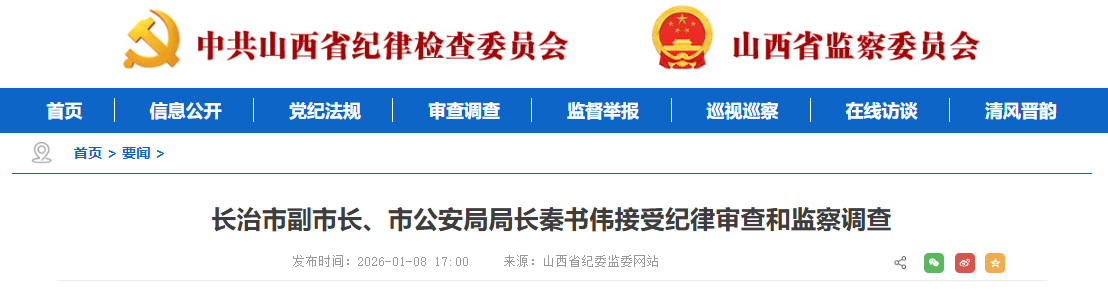 长治市副市长、市公安局局长秦书伟涉嫌严重违纪违法,目前正接受省纪委监委纪律审查和监察调查。
