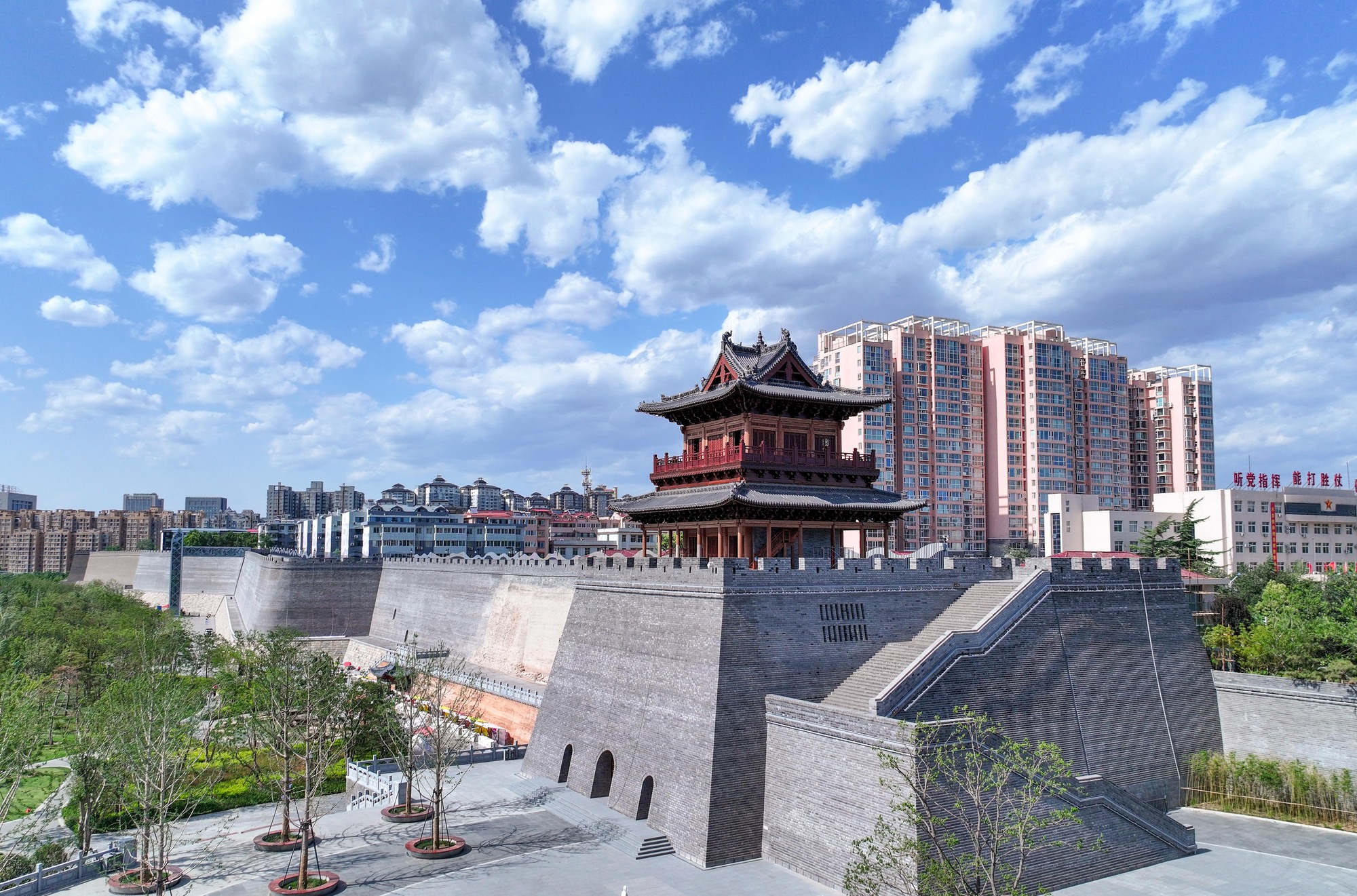 蓝天白云映衬下的临汾古城墙角楼(央广网发 闫锐鹏摄)