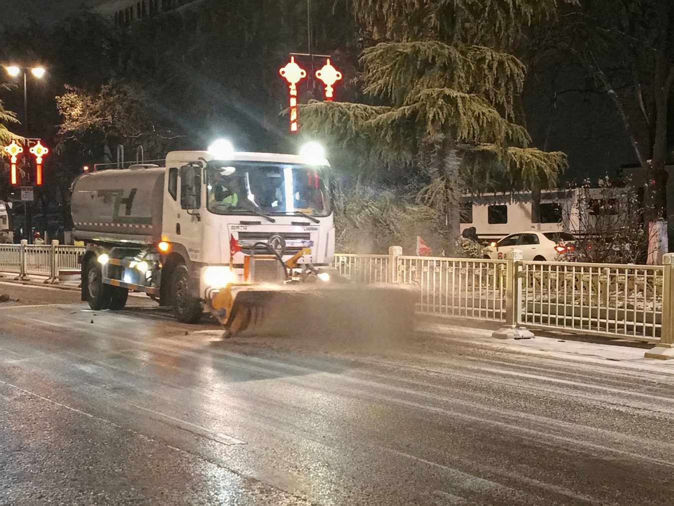 19日晚上雪势渐大,路面开始出现薄冰。莲湖区城管执法局持续对道路积雪结冰情况开展现场检查和不间断巡查,科学调配保洁力量,实行“24小时轮班制”作业——凌晨2时,第一批作业的环卫工人们已连续奋战5小时,在临时休息点喝上一口热水、换上干爽的棉鞋后,第二批队员立即接过工具,投入新一轮扫雪除冰作业。