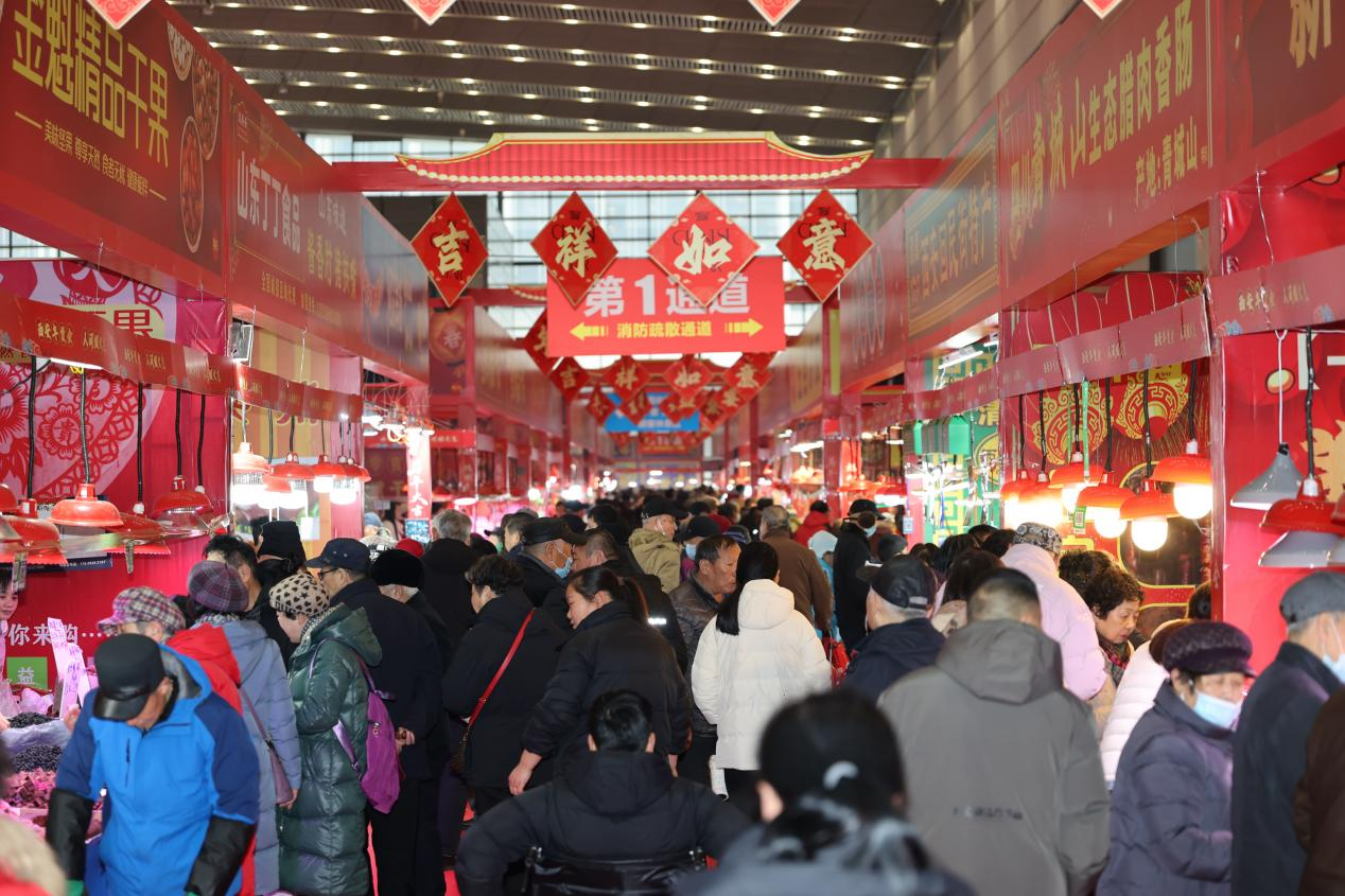 步入1.6万平方米的展馆,满目皆是喜庆的中国红,洋溢着吉祥热烈的节日氛围。尽管已是开幕第五日,馆内依旧人潮涌动,提着手拉车、拎着大号购物袋的市民们在各个展位前流连忘返,询价声、欢笑声、孩童的欢闹声此起彼伏。