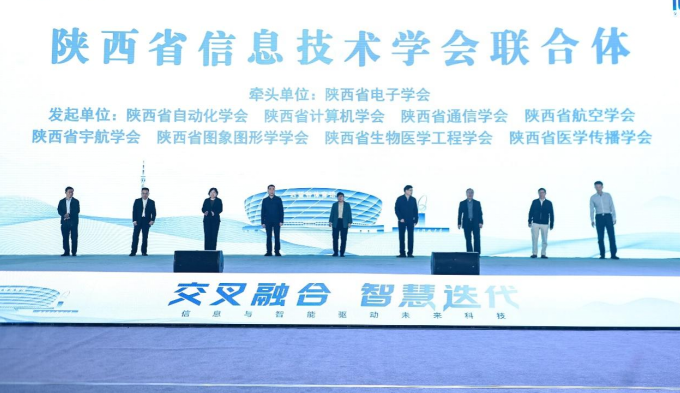 启动仪式环节,陕西省电子学会、陕西省自动化学会、陕西省计算机学会、陕西省通信学会、陕西省航空学会、陕西省宇航学会、陕西省图象图形学学会、陕西省生物医学工程学会、陕西省医学传播学会的代表们登台共同点亮大屏,陕西省信息技术学会联合体正式成立。