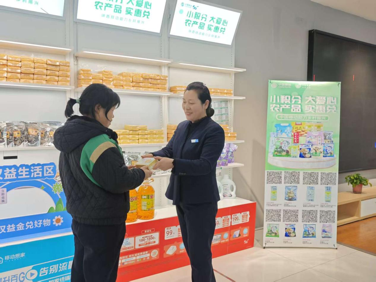 权益助农,让助农从“阶段性帮扶”转向“可持续赋能”。在韦曲广场营业厅,厅经理王雪利向每一位到厅客户介绍:“您的移动权益金,能变成一碗实实在在的家乡味道,既贴心又助农。”一位刚兑换了小米的阿姨满意地说:“权益金兑换很实在!东西品质好,用得上,兑换也方便!”