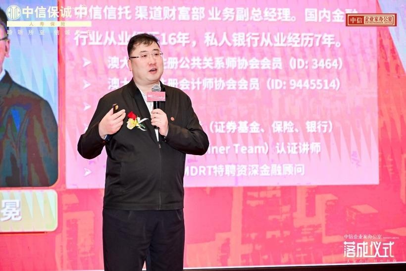 随后,中信信托渠道财富部业务副总经理刘加冕先生从信托视角分享了财富传承的专业见解,展现了“中信企业家办公室”如何通过“保险+信托”等综合工具,助力企业家实现财富的稳健保值与有序传承,彰显了平台在财富传承领域的专业深度与资源整合能力。