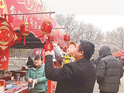 秦都区年货大集上,灯笼与孩童笑脸相映成趣。