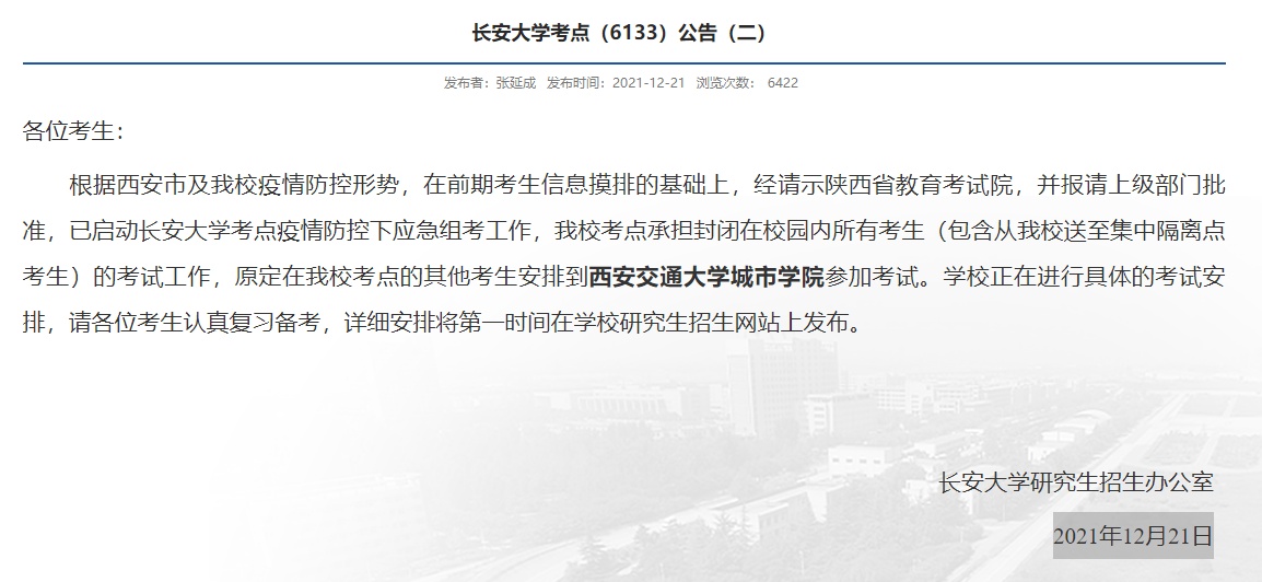 21日,长安大学发布公告称,长安大学考点承担封闭在校园内所有考生(包含从长安大学送至集中隔离点考生)的考试工作,原定在长安大学考点的其他考生安排到西安交通大学城市学院参加考试。
