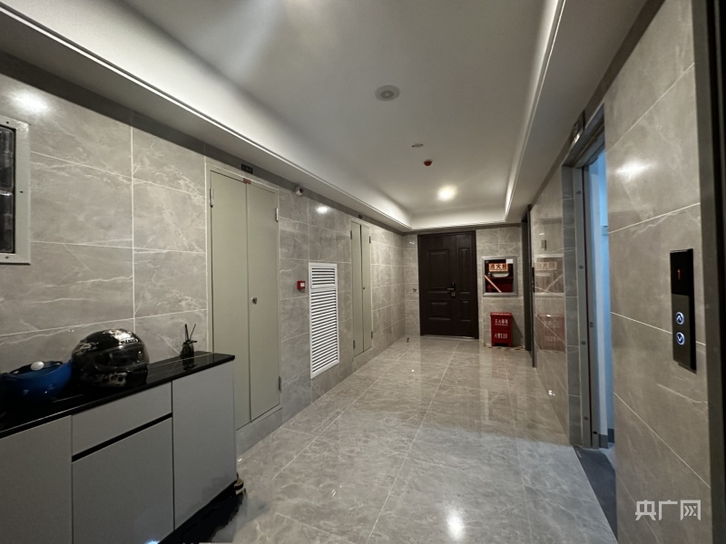 记者随同王女士进入小区时看到,小区绿化较多,环境整洁,晚上楼栋内住户亮灯较少。随后记者跟王女士一同进入1号楼,乘电梯到王女士家所在的楼层查看情况。她所居住的楼层一梯两户,王女士和对门邻居家中间间隔空间较大,楼梯间和公共区域面积比较大,十分宽敞。“我们这个小区公摊面积确实比较大,要是想打乒乓球,在楼道里放一张球桌都可以。”王女士调侃说。
