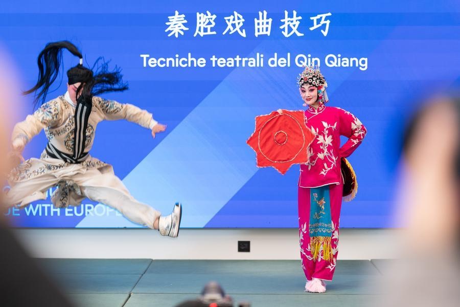 11月24日,在意大利米兰举行的“丝路长安·对话欧洲”城市文化交流活动启动仪式暨西安城市推介会上,演员在表演秦腔戏曲。(新华社记者 刘沉冰 摄)