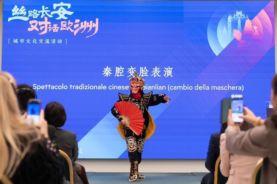 11月24日,在意大利米兰举行的“丝路长安·对话欧洲”城市文化交流活动启动仪式暨西安城市推介会上,演员在表演秦腔变脸。(新华社记者 刘沉冰 摄)