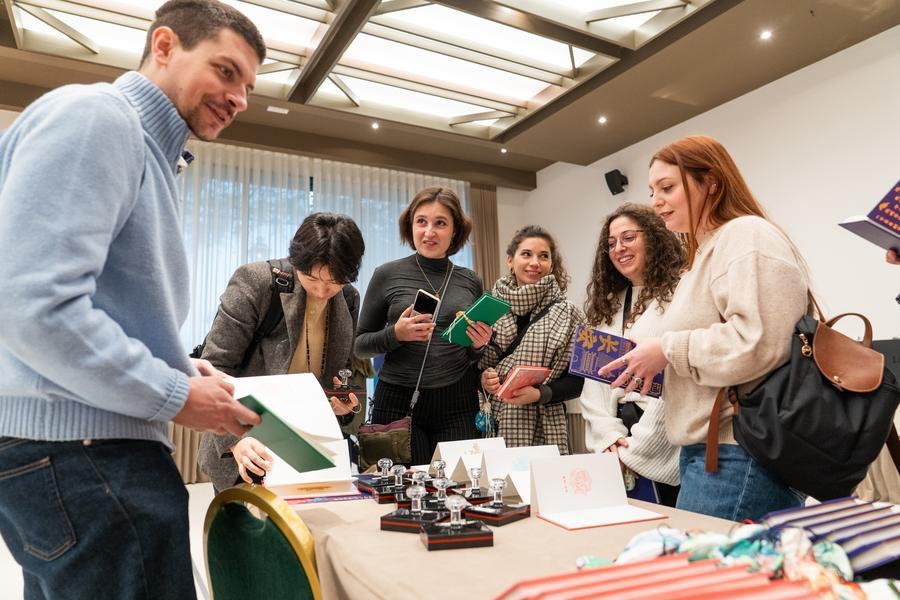 11月24日,在意大利米兰举行的“丝路长安·对话欧洲”城市文化交流活动启动仪式暨西安城市推介会上,来宾在体验中国文创产品。(新华社记者 刘沉冰 摄)