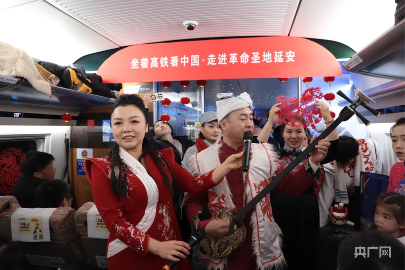 飞驰的车轮串联起革命圣地与千年古都,一场以“红色记忆+文旅”为主题的高铁文化盛宴在对开列车上同步绽放。依托西延高铁这条“红色文化动线”,中国铁路西安局集团有限公司创新打造“红色记忆+文旅”“文旅+红色记忆”双主题车厢,将陕北大地的革命精神、非遗文化与自然风光融入现代出行体验,让旅客在疾驰的列车中重温峥嵘岁月,感受黄土高原的独特魅力。