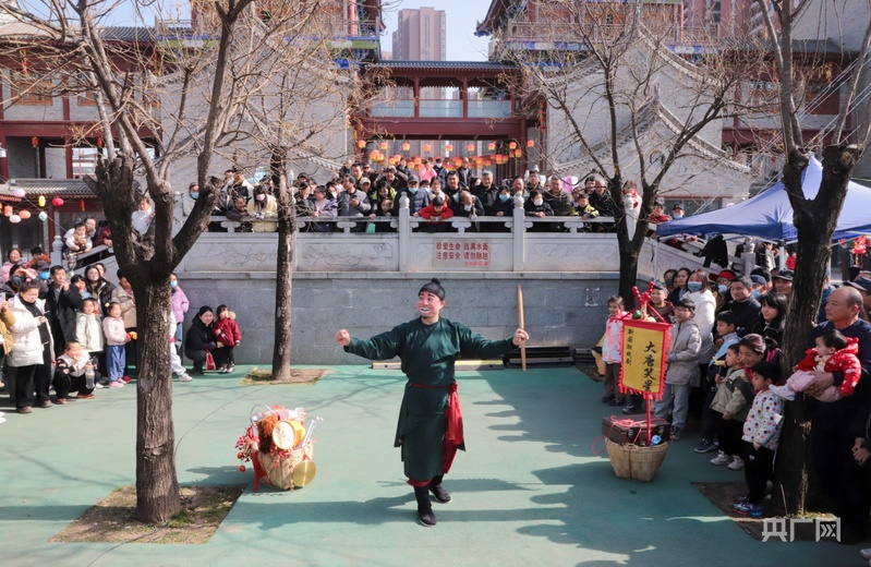 11日,记者在渭南老街看到,青石板路两侧挂满大红灯笼,非遗大集人流不息,处处洋溢着浓郁的节日气息。老街广场上,新国潮戏剧“大唐笑星”正在展演,扮相滑稽的演员在铿锵锣鼓中腾挪跳跃,不时与观众进行互动,引得围观群众连连喝彩。不远处,澄城刺绣、渭南剪纸、大荔面花等非遗传承人现场亮绝活,不少年轻人驻足体验,用手机直播向网友分享指尖上的年味。