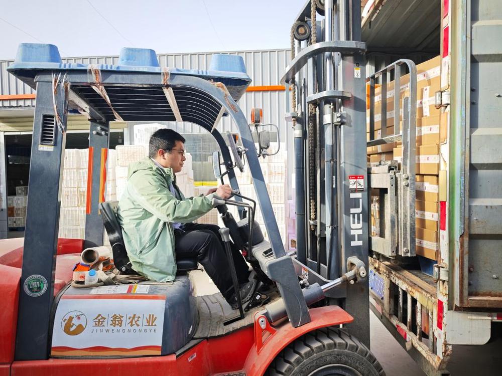 2026年2月10日,杨一凡用铲车把装箱好的柿饼送上即将发往快递分拣中心的货车。新华社记者王泽昊 摄
