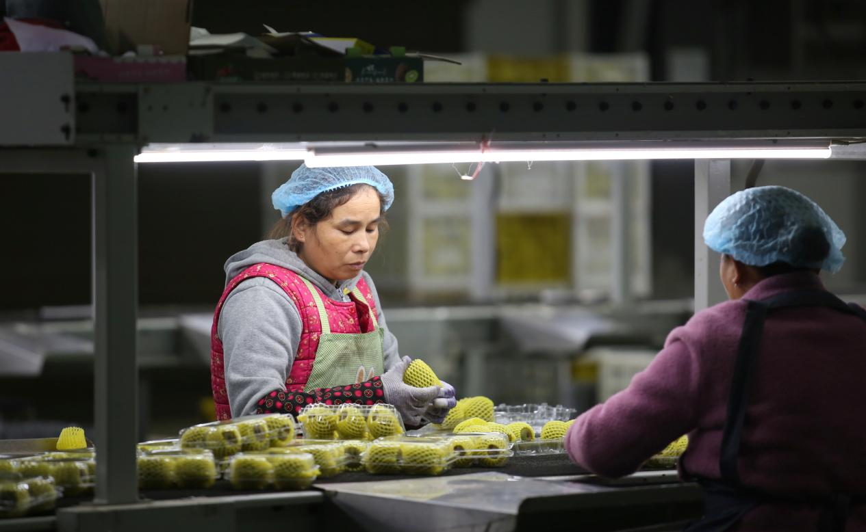 陕西猕猴桃迎采收旺季,正在流水线上选果的果农。
