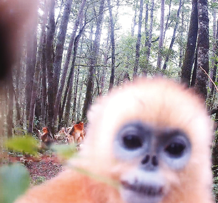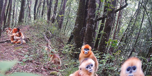 近日,陕西省太白林业局工作人员在取回红外相机并梳理今年第三季度的监测视频时,发现在30余段镜头画面里,金丝猴群集中亮相,并展现出丰富灵动的生活场景。在8月17日的画面中,成年金丝猴灵活穿梭于林间精准采食嫩叶果实,幼猴则在树干间跳跃追逐相互嬉闹,更有几只幼猴主动靠近相机,歪头凝视,做出“自拍”般的萌态动作,配合灵动眼眸与俏皮姿态,仿佛在与人类展开无声“对话”(见右图)。这些画面不仅记录了金丝猴在自然状态下的真实生活场景,也为研究其生活习性和保护工作提供了宝贵的影像资料。