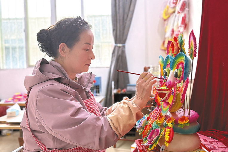 “面花上色,是赋予面花灵魂的最后一步。”康妙云用细笔蘸取颜料,轻轻点在面花上,“同样的颜色,不同的人上出来效果截然不同。”她的秘诀在于颜色一定要干净,不能混色,而且要常换水。渐变上色要一点一点晕染,让颜色过渡自然。最后刷上一层食用油,形成保护膜,让面花始终保持绚丽的色彩。
