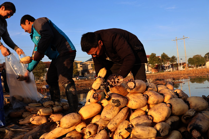 梁山镇荣国村的藕田里,挖藕人身着防水服,在泥沼中精准采挖,一根根肥硕的莲藕破泥而出,日销数千斤。莲藕种植是荣国村的传统优势产业,通过土地流转、基地务工等方式,村民实现了“租金+薪金”的双重增收。