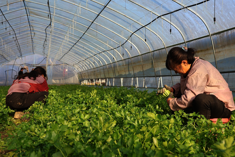 村民在百顺盛旺蔬菜种植基地采收芹菜。