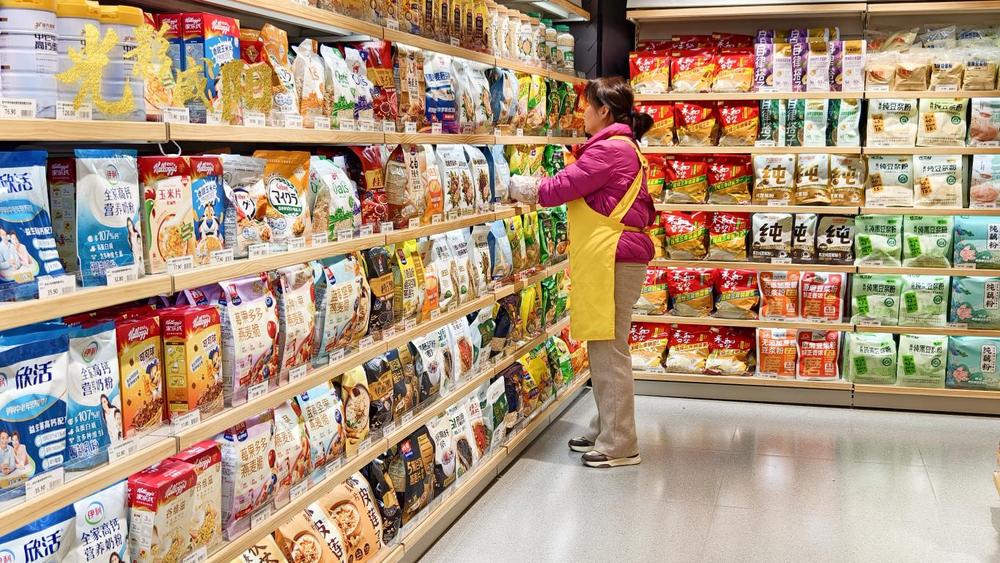 超市工作人员在整理商品