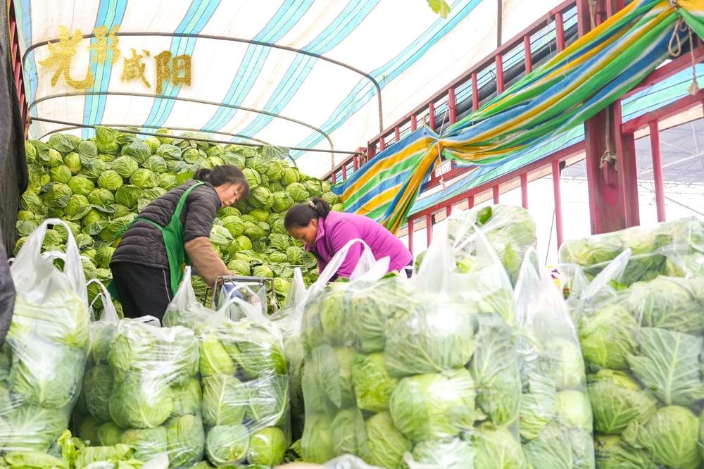 在咸阳新阳光西北农副产品交易中心,新到一车包菜,工作人员正在分装卸货