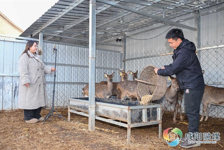 1月28日午后,走进旬邑县湫坡头镇西洼村的梅花鹿养殖场,20余只体态矫健的梅花鹿低头觅食、悠闲漫步。“新农人”张永涛熟练地调配饲料、投喂鹿群;妻子牛敏则对着手机镜头,细致讲解鹿茸、鹿肉等特色产品,与网友热情互动。