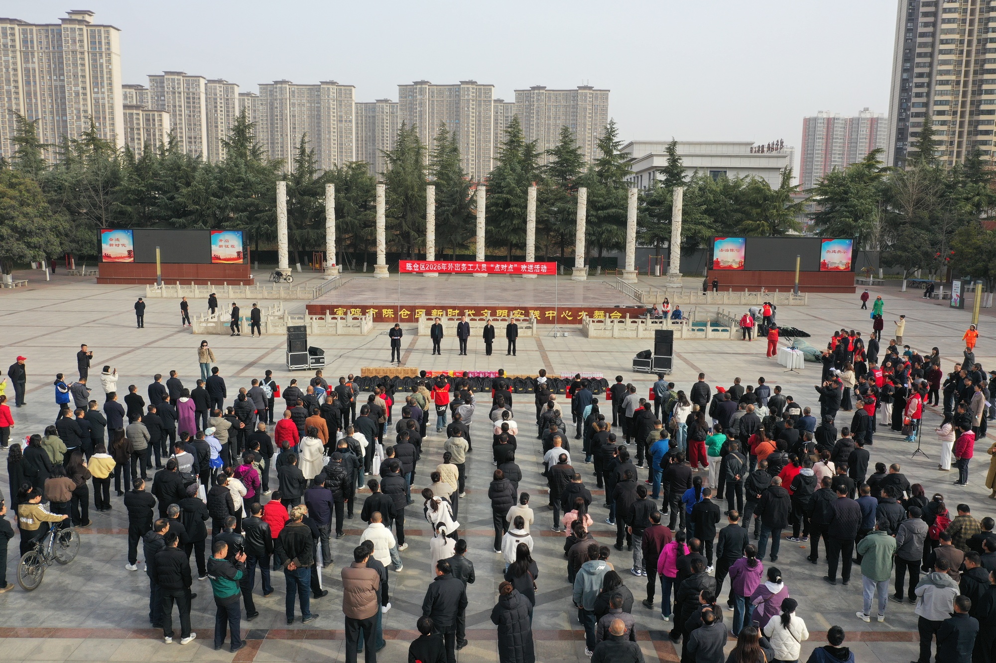 正月初六,陕西省宝鸡市陈仓区法治广场热闹喜庆,全区首批外出务工人员“点对点”欢送活动举行。