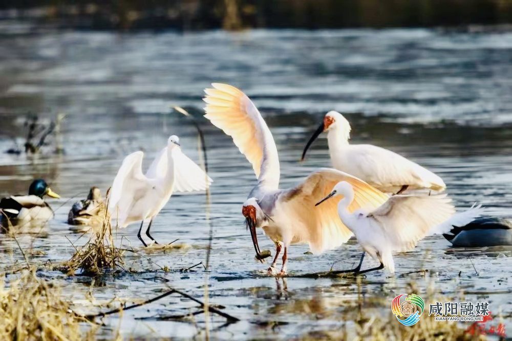 朱鹮在渭河畔嬉戏