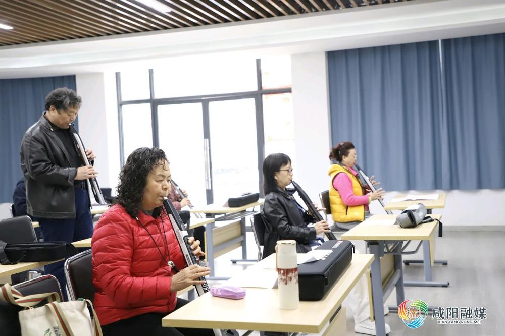 秦都区陈杨寨街道河南街社区新时代文明实践站活动中心内,居民正在学习电吹管。记者 谢祯/图