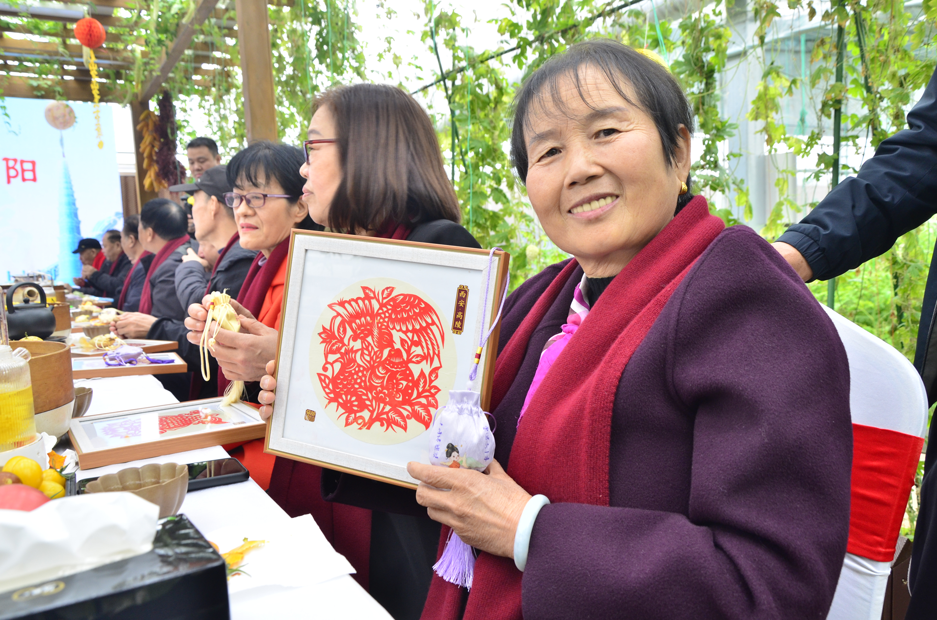 示范园内绿意盎然,一颗颗鲜嫩欲滴的全季西红柿掩映在绿色藤蔓间,成为茶话会最鲜活的背景。活动现场,非遗文化与本土风情交织,非遗剪纸艺人以“丰收”“长寿”为主题,将近年来高陵独特魅力与风土人情剪进红纸;绣工精巧的香包散发着艾草清香,虎头鞋憨态可掬的造型唤起老人们的儿时记忆,大家围坐在一起,或动手体验非遗技艺,或畅谈过往生活变迁,笑声与田间微风交融。
