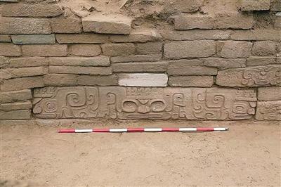 皇城台考古工作启动于2016年,迄今持续工作三年,主要集中在东护墙北段上部、皇城台门址和顶部大台基区域,收获重大。2018年,通过进一步考古发掘,皇城台台顶格局和轮廓逐渐清晰。考古人员发现皇城台台顶的一些大型建筑坐落在一处“石包土”的大型台基上,大致呈南北向长方形。大型台基东西宽约80米、残高约4米,南北长度约在120米以上。“新发现的30余件石雕作品集中出土于大型台基南护墙墙体的倒塌石块内,有一些还镶嵌在南护墙墙面上。”据考古专家介绍,这些石雕绝大多数是雕刻在石块一面的单面雕刻,雕刻内容分为符号、人面、神面、动物、神兽等,有一些画面长度近3米,以中心神面为中心,两侧对称雕出动物和人面,体现出成熟的艺术构思和精湛的雕刻技艺。本报记者 赵争耀