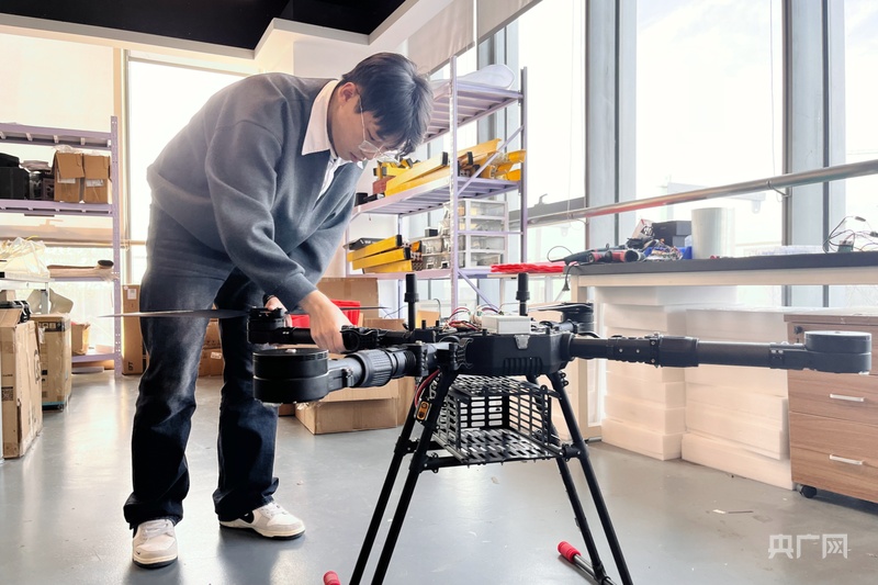 工作人员为一架即将交付的工业巡检无人机装上桨叶(央广网记者 陈锵 摄)