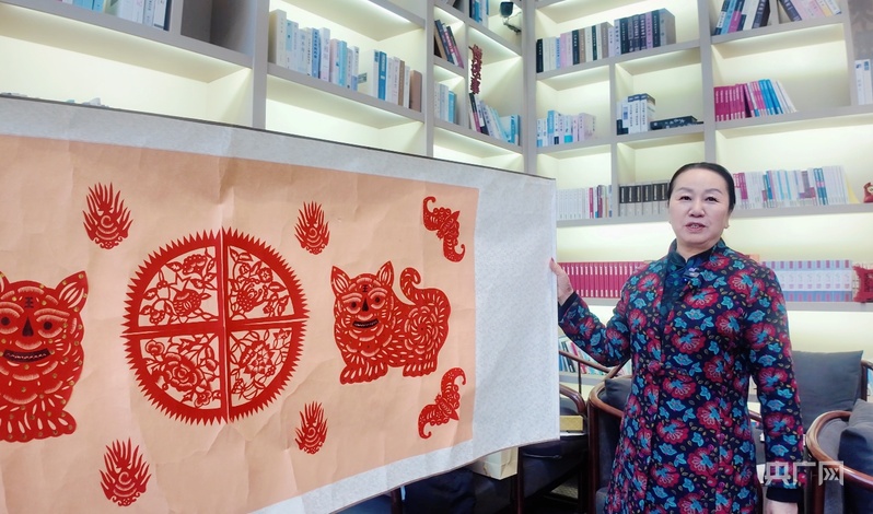 陕北民俗博物馆里,榆林剪纸非遗传承人高小连展示剪纸作品(央广网记者 陈锵 摄)