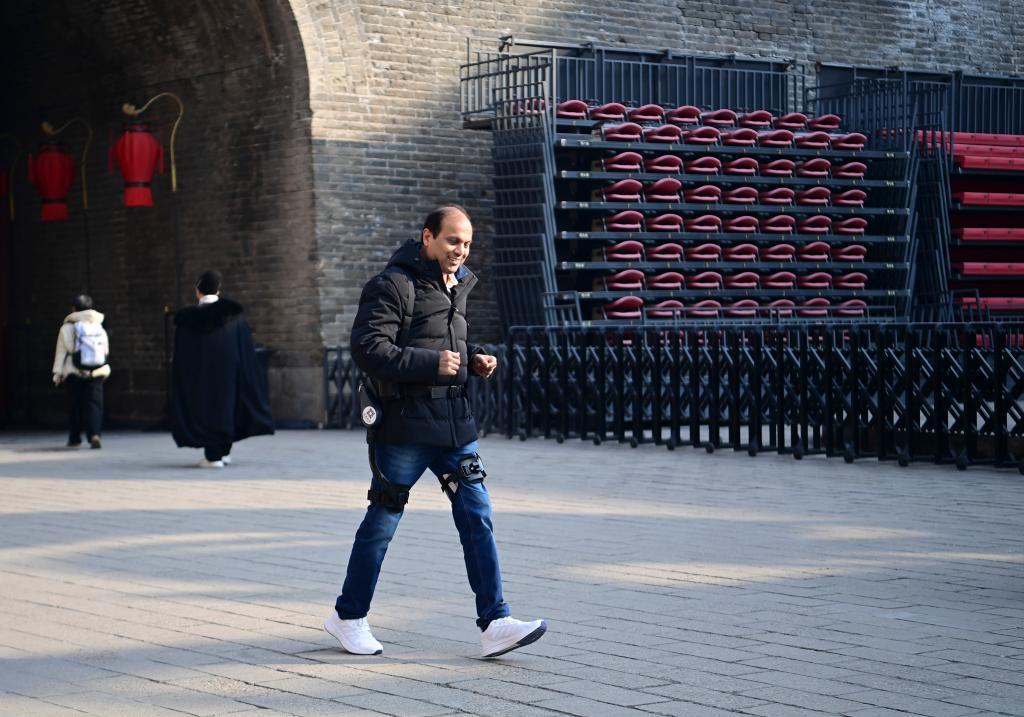 在外骨骼机器人城墙租赁点,两位外籍游客正兴致勃勃地穿上这一智能设备。一名来自埃及的游客穿好设备后,试着抬腿跳跃了几下,随后兴奋地将手机交给记者,希望帮他拍摄一段跑步的视频。他说:“这个体验太棒了,感觉就像有人在推你一样!”