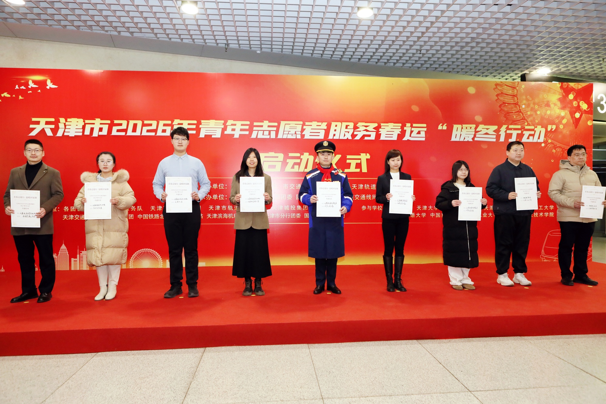 央广网天津2月3日消息(记者张强)春潮涌动归乡路,青春聚力暖人心。日前,天津市2026年青年志愿者服务春运“暖冬行动”启动仪式在天津站隆重举行。本次活动由市委社会工作部、市交通运输委、团市委、天津轨道交通集团联合主办,各区、重点高校、交通运输服务单位团委、相关负责人及青年志愿者代表120余人齐聚一堂,共同拉开本年度春运志愿服务的序幕,以青春之力为万千旅客的返乡之旅保驾护航。