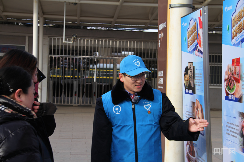 蓟州北站客运员白静为出站旅客介绍蓟州特色美食购买点(央广网发 肖亦杰 摄)