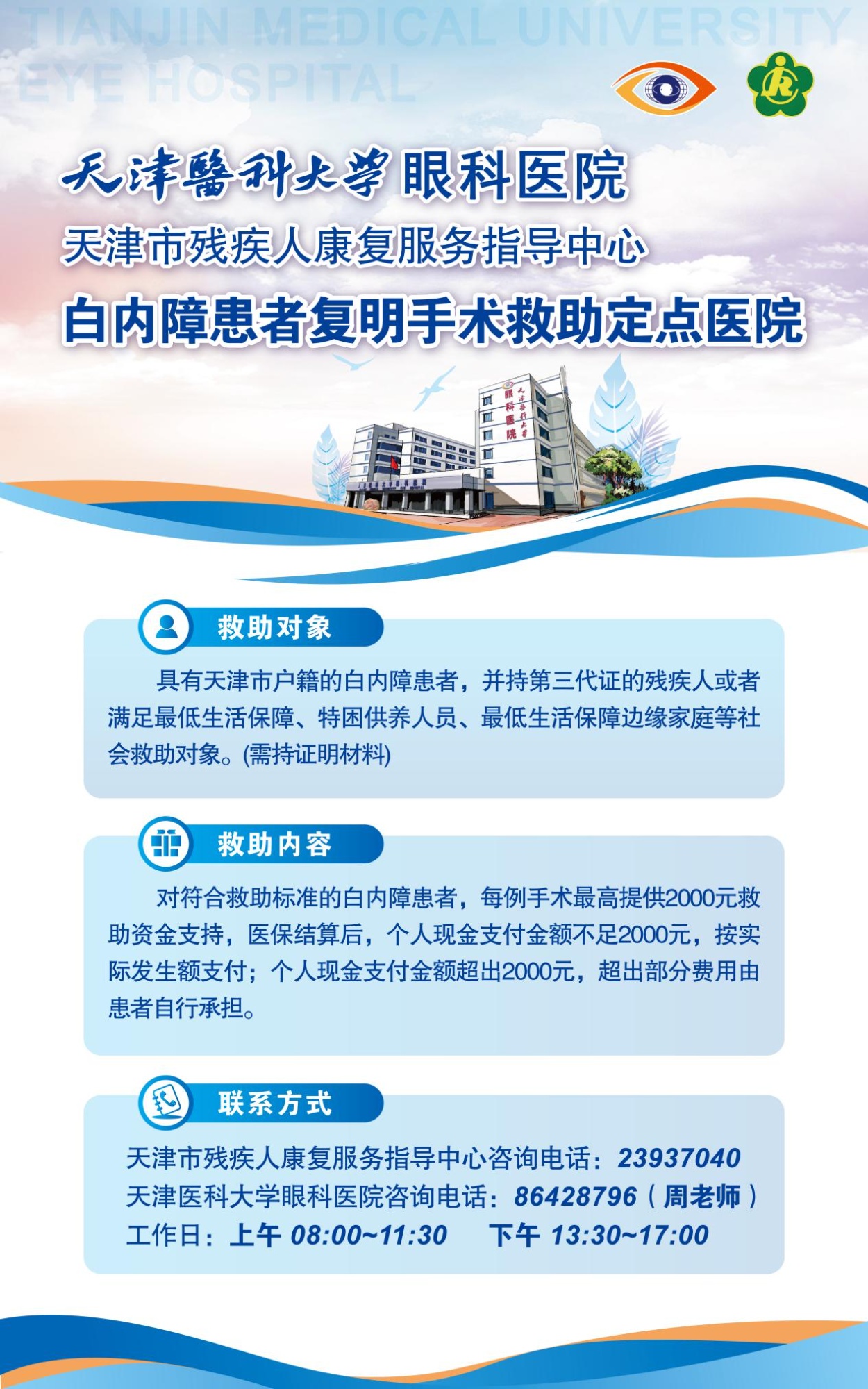 根据协议,符合救助标准的天津户籍白内障患者,包括困难群体、持第三代残疾人证者,以及最低生活保障、特困供养、最低生活保障边缘家庭等社会救助对象,每例手术最高可获2000元资金补贴。