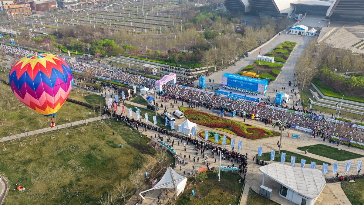 4月12日,2026天津软件园·中新天津生态城半程马拉松在天津国家海洋博物馆南广场开跑。