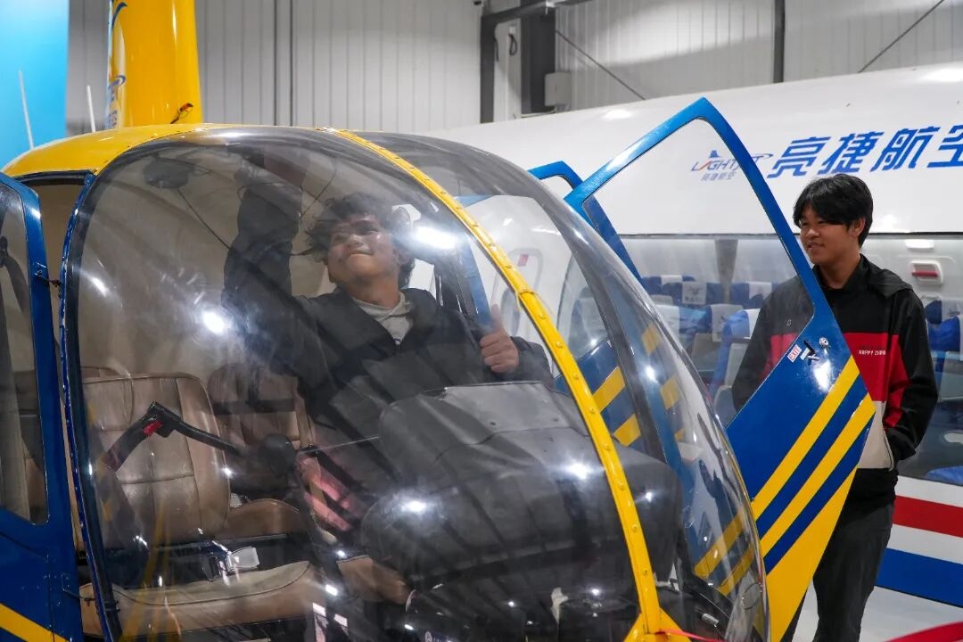 刚踏入航空机库实训室,泰国留学生普冠就被停放在机库的各种类型实训飞机吸引,快步走上前抚摸机身。这份对航空技术的好奇,成为留学生们深入体验航空专业的契机。