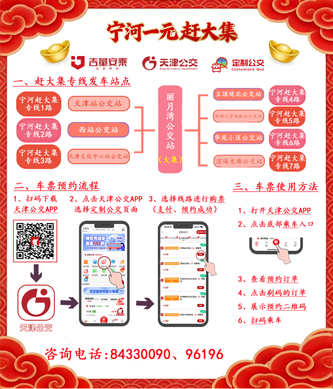 惠民服务暖人心。一元直通车:7条“一元直通车 宁河赶大集”直达专线,网络预约购票,全程高速,一站直达!免费便民服务:1、2号场地设置免费茶水站、临时休息区,逛累了随时歇脚。移动游客服务中心:公平秤、市场监督、医疗救助、失物招领……您的需求,我们全力保障!