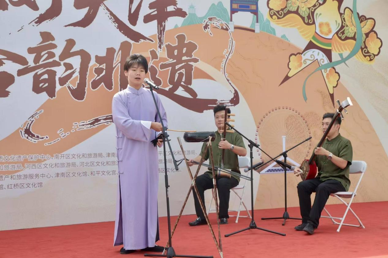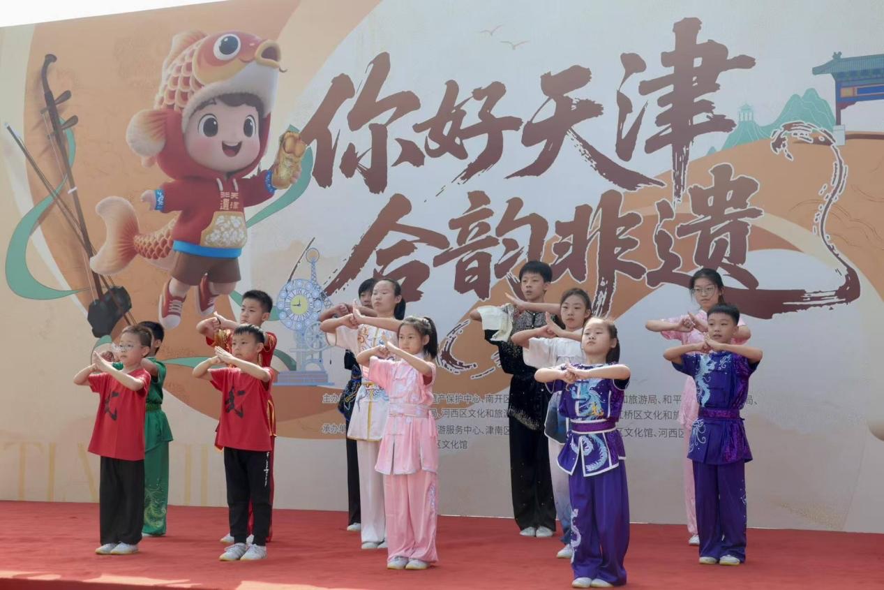 舞台之上,南开区非遗项目“太乙金世剑”率先闪亮登场。英姿飒爽的表演者们手持各式兵器,一招一式婉若游龙,引得观众阵阵喝彩。随后,“拦手门”武术、金派梅花大鼓等节目接续登场。而与舞台表演相呼应的,是沿河岸铺开的非遗市集:泥人张彩塑摊位上,栩栩如生的人物仿佛下一刻就要开口说话。杨柳青年画摊位上,胖娃娃的喜庆笑容感染着每一位驻足者,让人不禁心生欢喜。集章打卡的年轻人穿梭于各个摊位之间,在本子上留下一个个珍贵印记,也将这些美好记忆“盖”进心里。