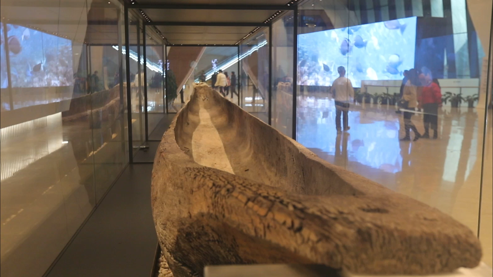 展厅中的唐代独木舟是天津国家海洋博物馆“镇馆之宝”之一(央广网记者 周思杨 摄)
