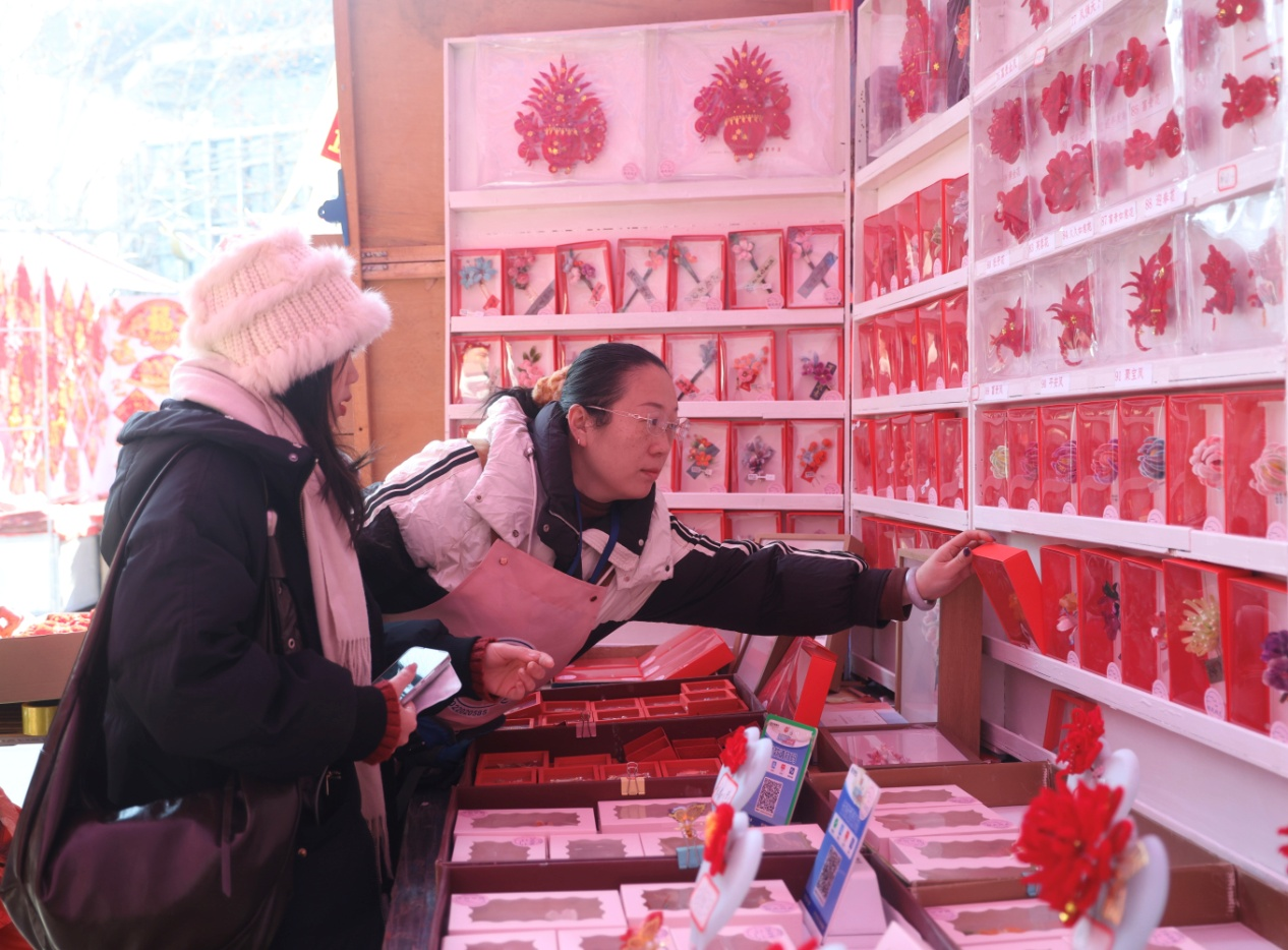 走进玉皇阁广场,各家招幌高挂,吊钱随风轻舞,春联福字琳琅满目,处处洋溢着喜庆祥和的节日气息。本次吊钱市场共设约20个特色展位,集中展销吊钱、春联、福字、窗花、头花、灯笼等传统年俗用品,其中不乏天津本地非遗项目与创新设计的融合之作。“过年戴绒花,寓意吉祥如意、辞旧迎新。”在非遗绒花展位前,摊主张琨一边熟练地摆放绒花头饰,一边向围拢的市民游客讲解其历史渊源。绒花,谐音“荣华”,寓意荣华富贵。它源于唐代,流传至今。绒花需要经过炼丝、染色、拴绒、造型、组花等多道工序才能制作出来。以前家中儿女多,过年时老人要戴满头的绒花,寓意着来年红红火火。非遗手作,如今通过这样的市集形式重回大众视野,不仅唤起老一辈人的记忆,也让年轻人感受到传统手工艺的魅力。