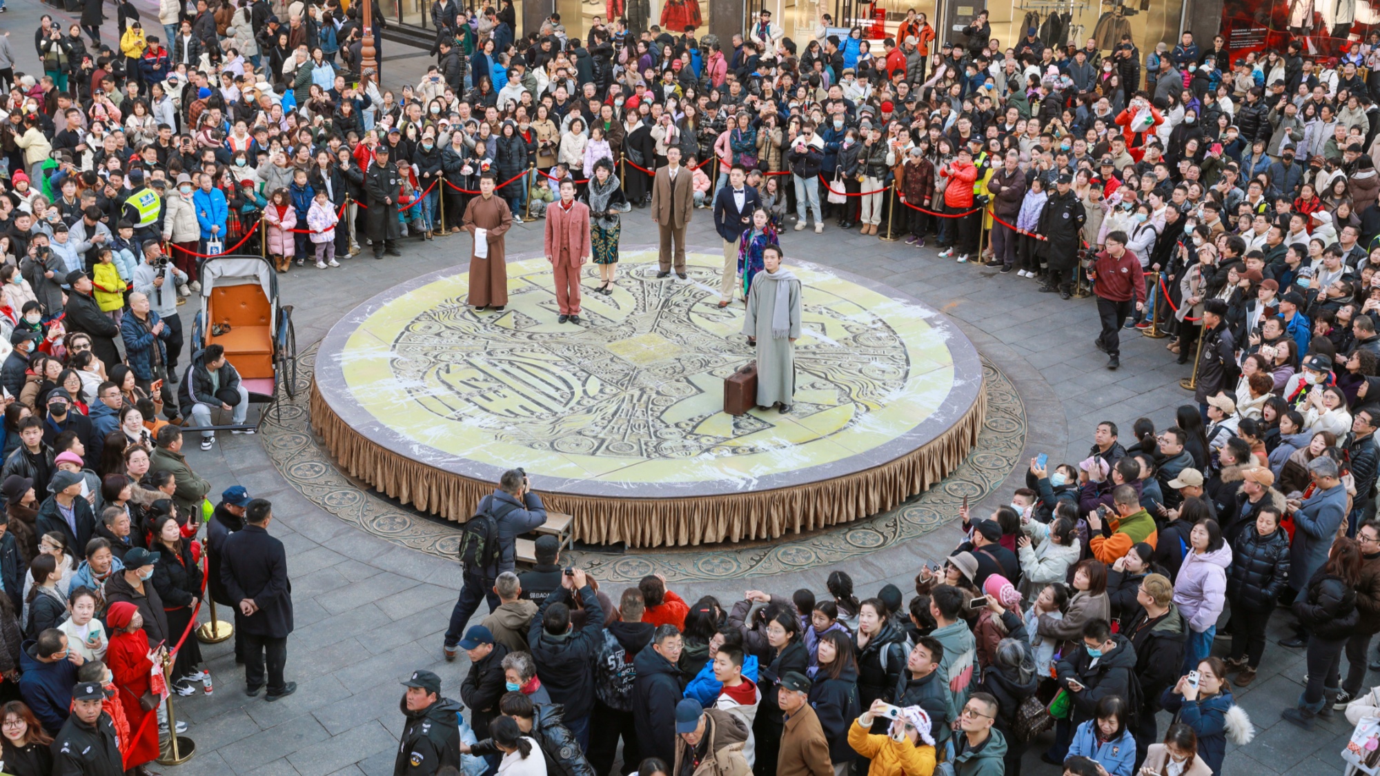 本次活动紧扣春节氛围特点,让艺术走出剧场、融入街巷烟火。从2月17日(正月初一)至2月23日(正月初七),每日的“戏聚天津·无处不沉浸”活动结合金街、古文化街、意式风情区等点位实际特点,安排特色演出,可谓人潮熙攘,好戏连台。古文化街戏楼与中国大戏院两大经典文旅地标,奏响着传统艺术与新春氛围交融,古典与现代交相呼应的动人乐章。古文化街戏楼上,天津市曲艺团让“非遗”与“曲艺”的韵律在海河之畔萦绕,老天津的地道年味儿在这一刻拉满。中国大戏院恰逢90岁华诞,以春节游艺会为津城送上新春厚礼,古筝快闪的清越旋律在院内流淌,古彩戏法的奇妙变幻引得观众连连惊呼,戏曲上妆展示让游客近距离感受戏曲妆容的匠心精致,京剧《霸王别姬》快闪更是将现场氛围推向高潮,经典唱段搭配沉浸式演绎,让百年老戏院的传统戏曲在新春焕发出新潮活力。
