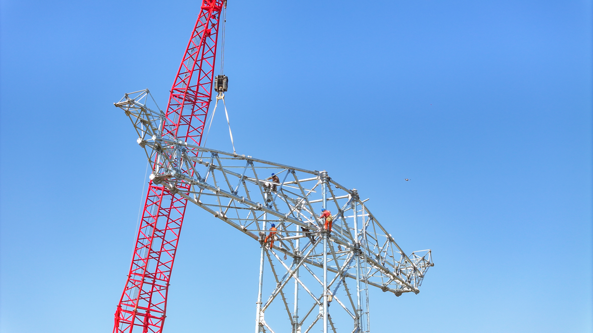 本次施工需两次跨越长深高速,为最大程度减少施工对道路交通的影响,现场多部门联动保障群众出行畅通。大同至怀来至天津南1000千伏特高压交流线路工程(天津段)业主项目部执行经理崔荣坤介绍:“我们联合高速运营、公安交管等部门建立联动机制,在高速公路两侧提前布置18米高的跨越架,在确保跨越放线施工的条件下,实现了全程道路不封道、交通不中断。”在施工工艺上,现场采用两个跨越段同步放线施工方案,运用无人机精准导引+机械化牵引的智能化施工模式,先通过无人机将导引绳精准投放至对侧铁塔,再由专业牵引设备带动导引绳、牵引导线完成跨越作业,全程实现机械化、智能化施工,施工过程平稳顺畅、定位精准,既保障了施工安全与工程质量,又大幅提升了跨越施工效率。
