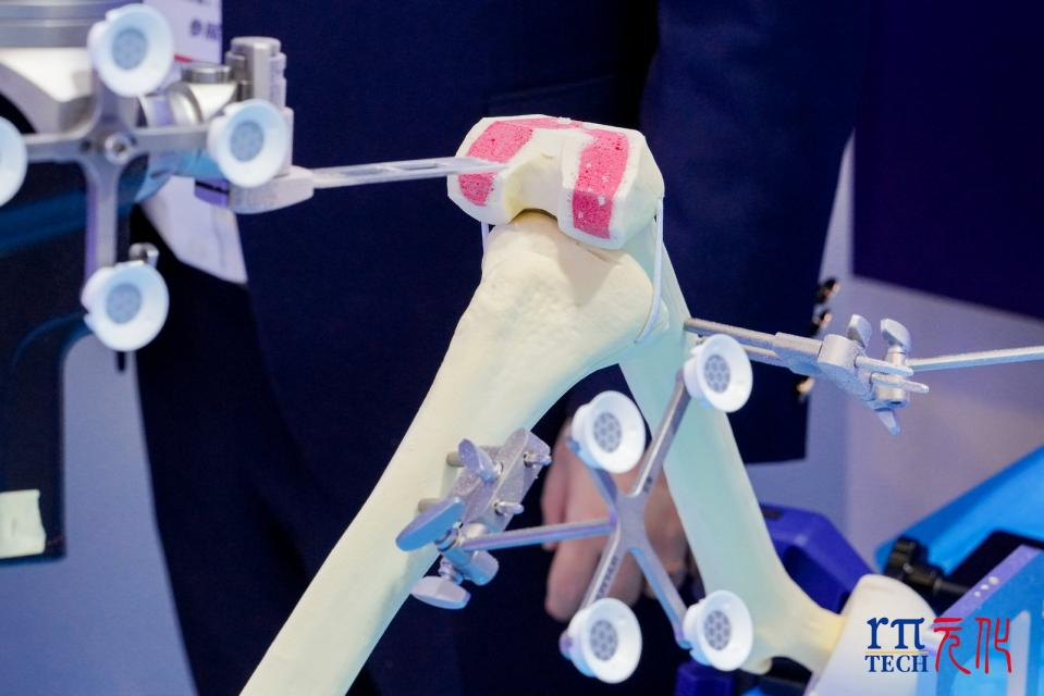 首个针对骨科手术应用场景完全自主研发的专用机械臂演示截骨(央广网发 元化智能科技供图)