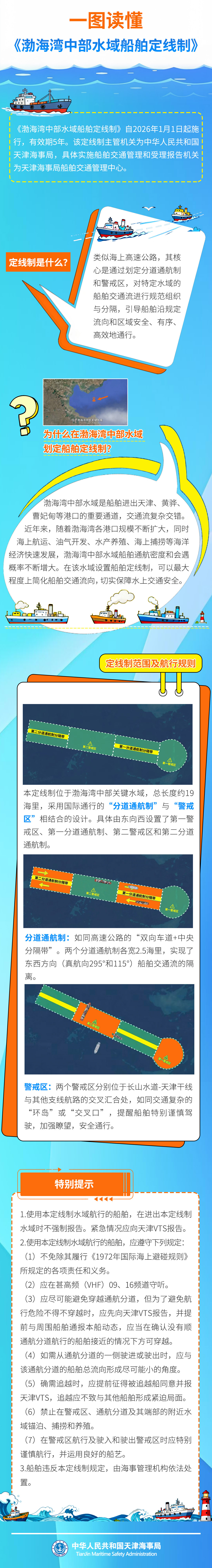 渤海湾中部水域船舶定线制的正式实施,标志着渤海湾水域的海上交通管理迈入规范化、精细化新阶段。下一步,天津海事部门将聚焦“安全第一”,确保本定线制发挥最大安全效益与社会效益,为渤海湾水域水上交通安全持续稳定与区域经济高质量发展贡献海事力量。