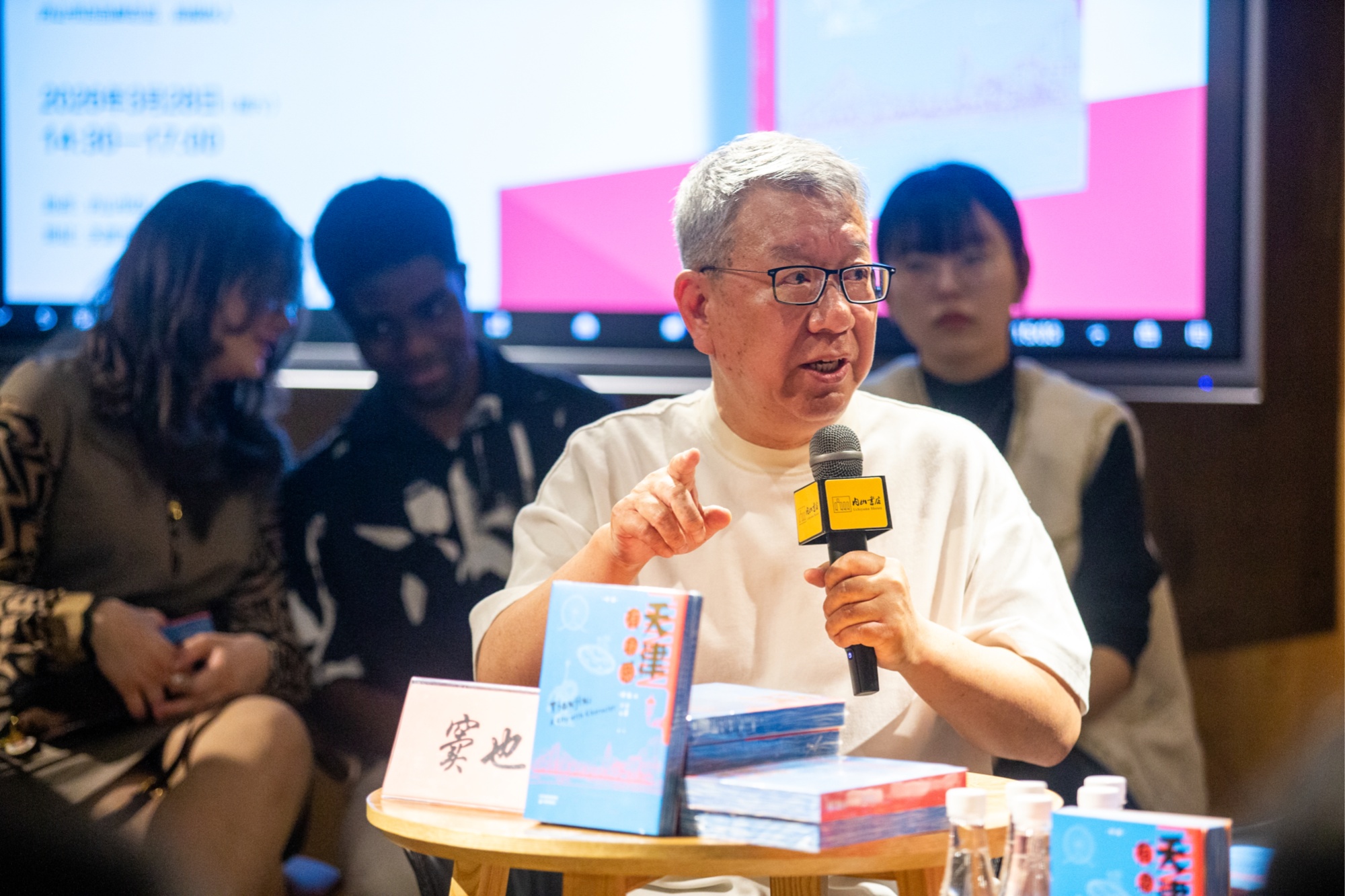 这次活动由天津教育出版社及内山书店、天津山楂萌文化传媒工作室联合主办。当天13:30,活动渐入佳境:暖场视频循环播放,一张张鲜活的城市影像,瞬间拉近了与现场读者的距离。读者们满怀期待地陆续到场,有序签到、选购新书,静静等候着分享会的正式启幕。书店里洋溢着热烈而温馨的文化氛围。