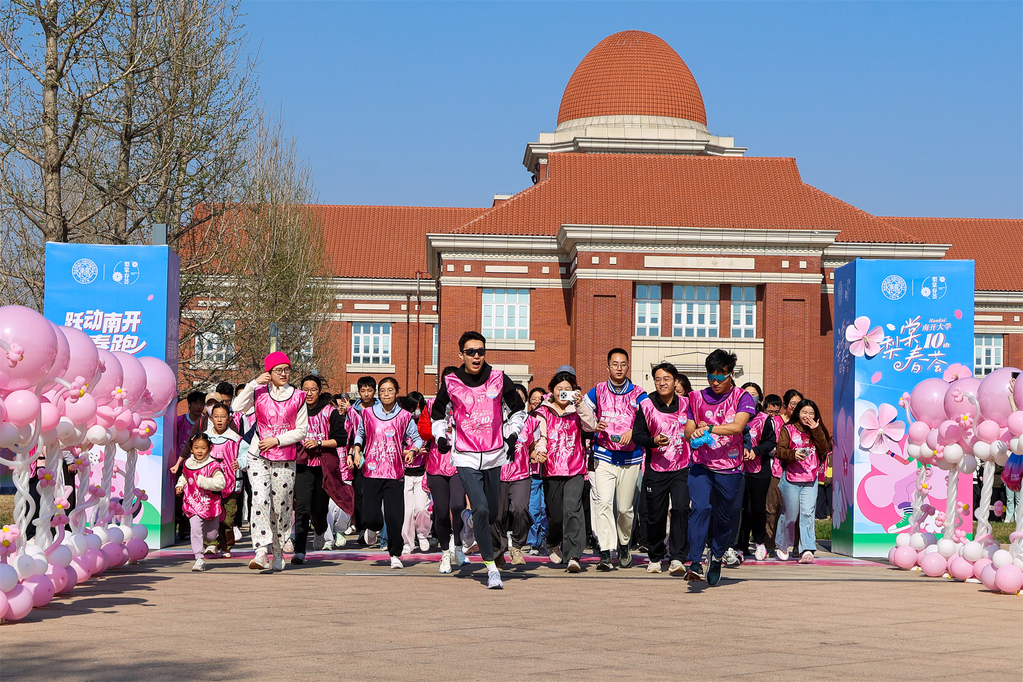 上午9时许,随着南开大学党委副书记牛文利和师生代表共同鸣响发令枪,参加“跃动南开”青春校园跑的500余名师生从思源堂前出发。一条亮丽的粉色“丝带”穿梭在校园间,步伐轻快,活力四射。