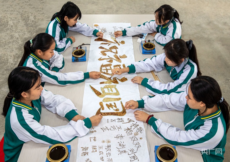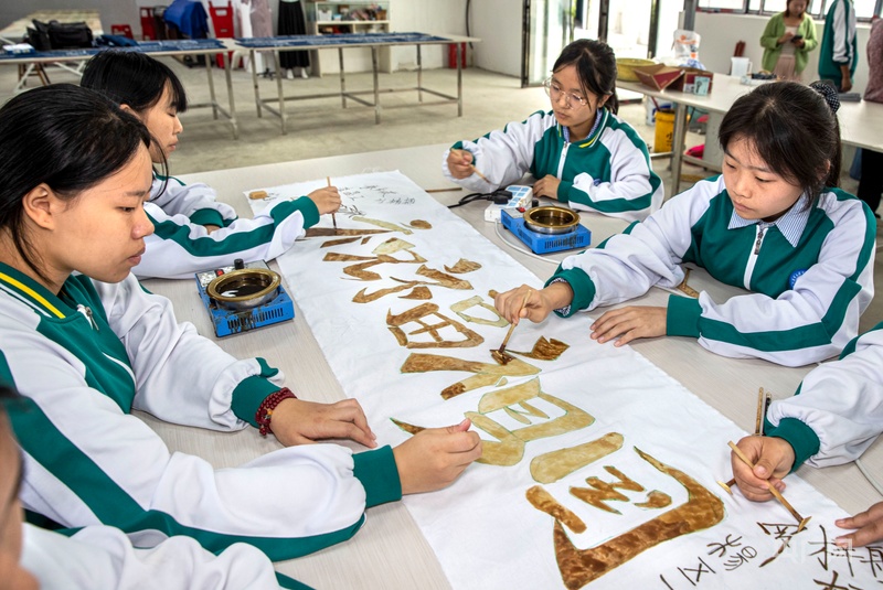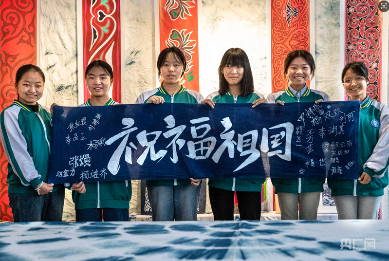 央广网毕节9月30日消息(记者栾小琳)9月29日,贵州省黔西市水西中等职业学校开展“传承非遗 喜迎国庆”为主题的非遗蜡染制作活动,学生在当地蜡染传承人的指导下,制作“祝福祖国”“龙腾盛世”等蜡染作品迎接即将到来的国庆佳节。